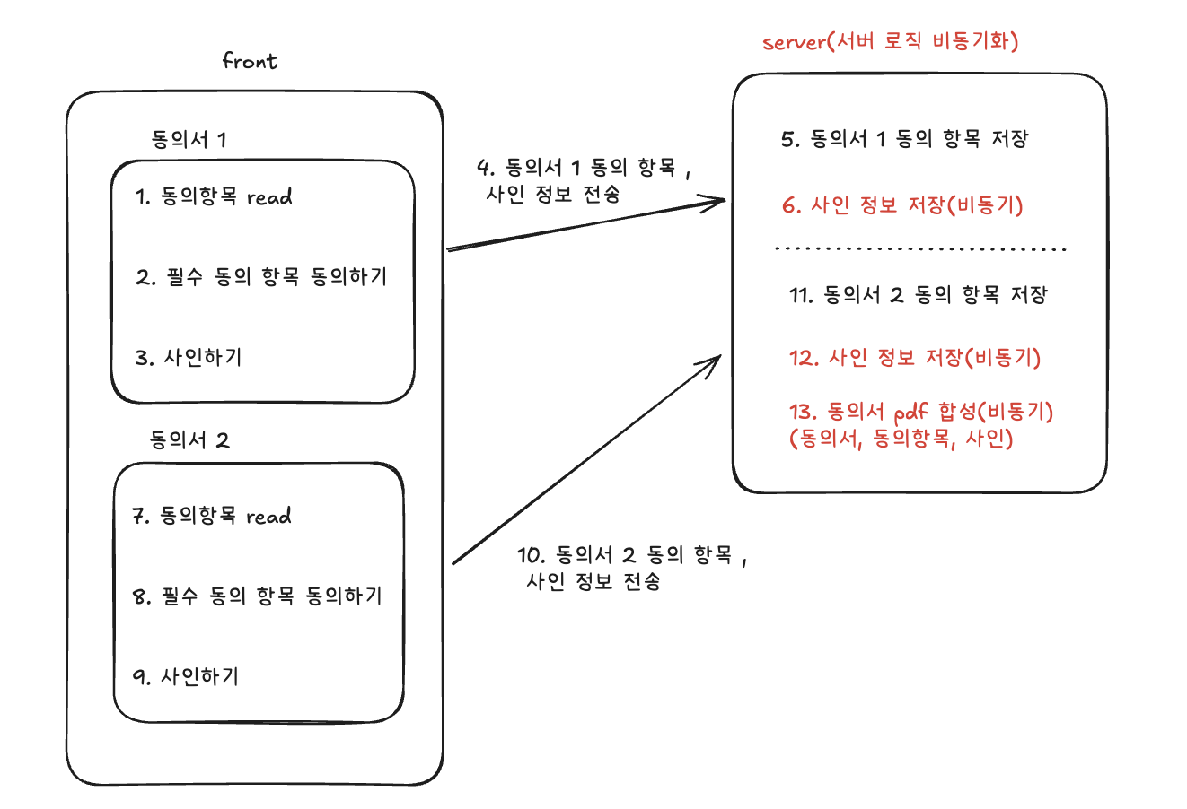 이 때, 초기 구현에서는 [동의서 1 사인 -> 동의서 1 저장 -> 동의서 2 사인 -> 동의서 2 저장 -> 동의서 합성] 의 과정이 동기적으로 이뤄졌습니다.